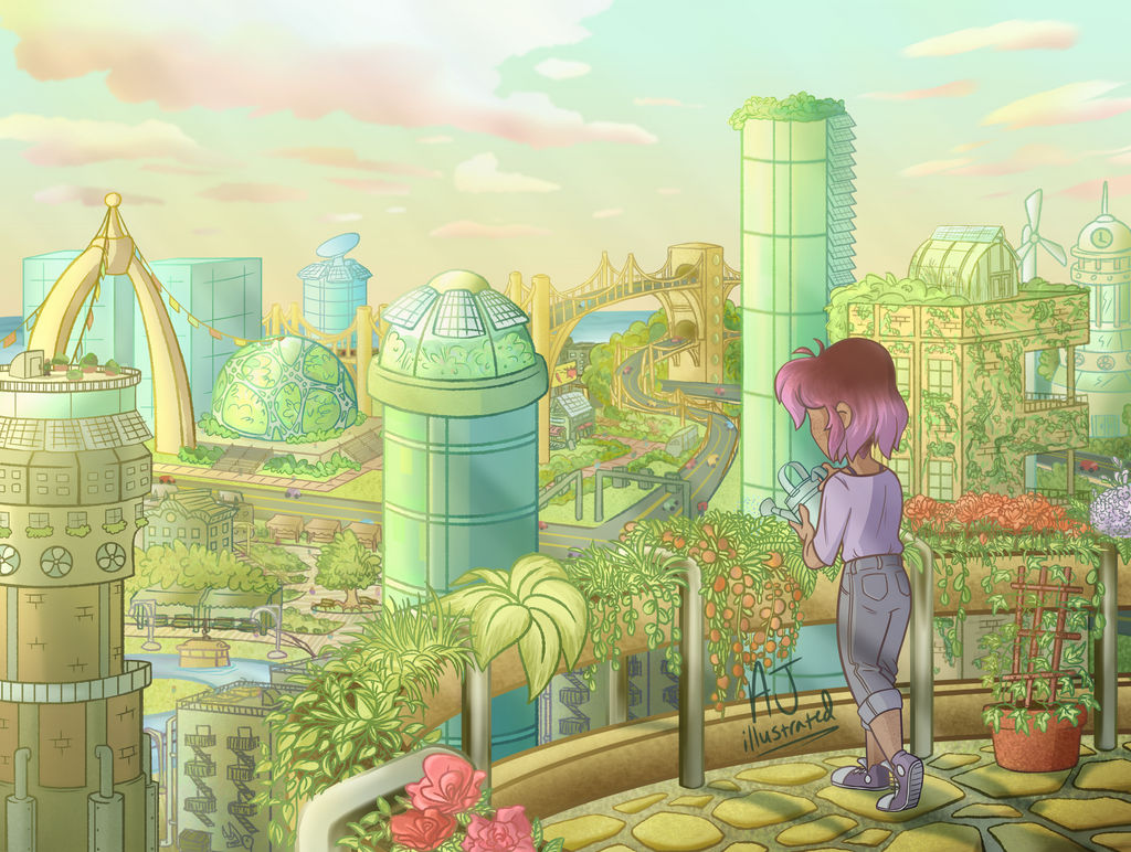 Solarpunk is an emerging subgenre of science fiction. You can think of it a a 21st-century evolution of cyberpunk, except hopeful and positive instead of depressive and dystopian. That’s on purpose. Solarpunk focuses on near-future, Earth-based sci-fi, about ways the human race comes to grip with climate change and learns how to work together to live sustainably on this Earth. It is a variety of “cli-fi,” or climate fiction: narratives about confronting, or falling to, the challenge of global climate change. Solarpunk is notable because it insists on presenting workable solutions to the manifold problems the human race faces as the world heats up. It is intended to inspire optimism and give people hope for the future.